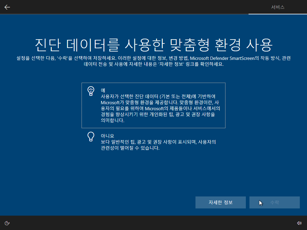 진단 데이터를 마이크로소프트에 보낼건지 물어봅니다.