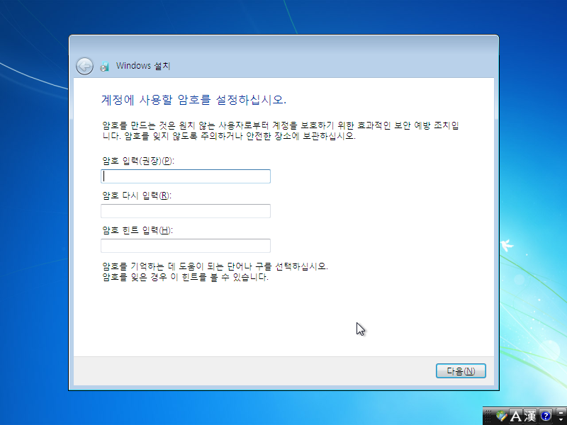암호를 설정합니다. 암호는 선택사항이므로 건너뛰셔도 됩니다.
